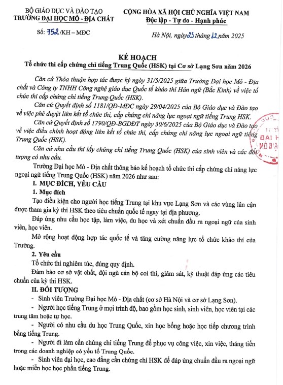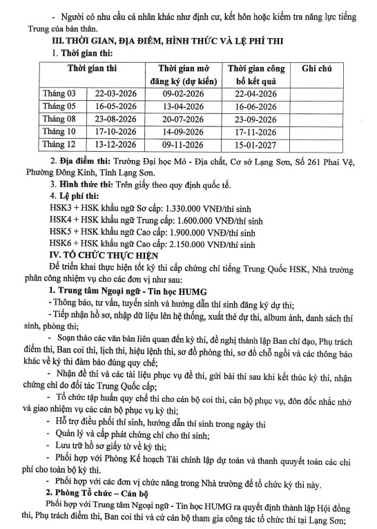 Kế hoạch tổ chức thi chứng chỉ tiếng Trung Quốc (HSK) tại cơ sở Lạng Sơn năm 2026
